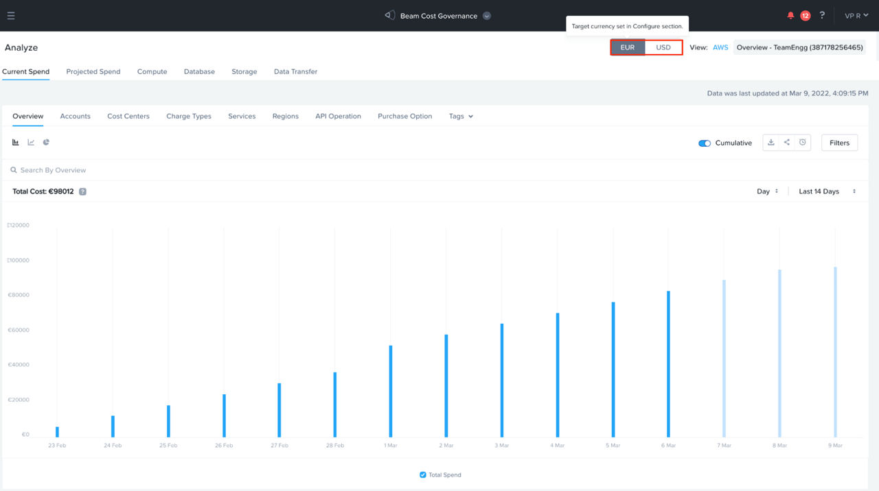 Once a currency is selected, all views and reports across spending analysis, Chargeback, Scope (custom resource group), Budget, Save (cost optimization), and the out-of-the-box reports will report spending in the chosen currency. Users can also choose to toggle across desired and source currencies with a simple click. The .CSV report downloads are dynamically adjusted to the currency the user selected.