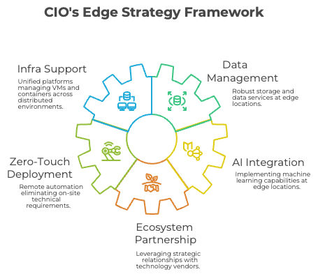 We believe that modern CIOs require five critical capabilities for effective edge strategy implementation. First, edge infrastructure support with unified platforms managing both virtual machines and containers across distributed environments. Second, data management expertise enabling robust storage and data services at edge locations. Third, zero-touch deployment and orchestration capabilities that minimize on-site technical requirements through remote automation. Fourth, AI integration knowledge to implement machine learning capabilities at edge locations. Fifth, ecosystem partnership management to leverage strategic relationships with technology vendors and systems integrators.