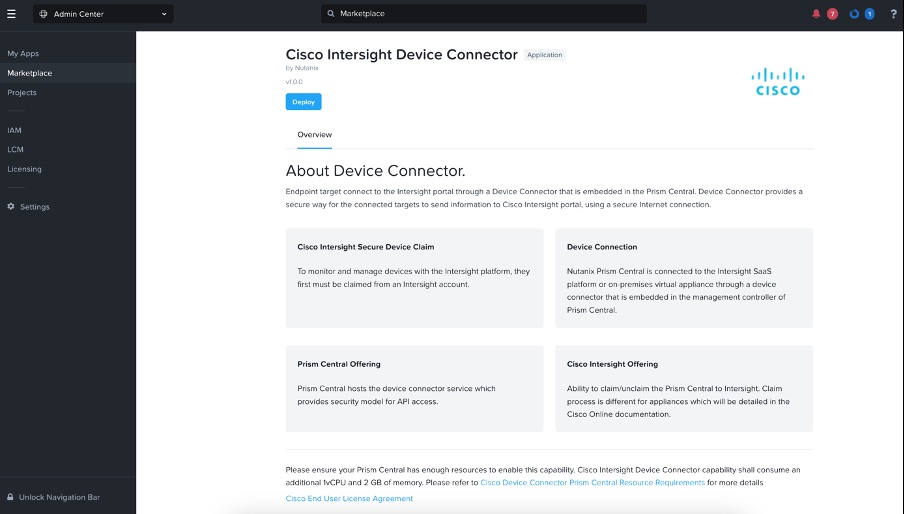 Enable on-demand. Simply deploy and manage the Cisco Intersight Device Connector app from the Nutanix marketplace.