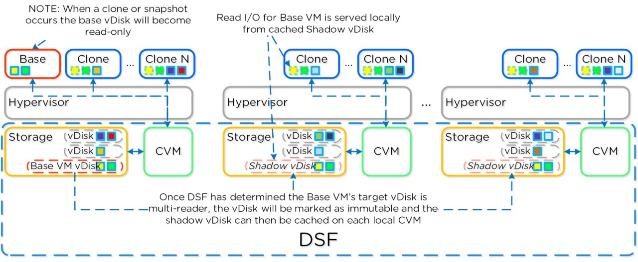 Once the disk is marked as immutable, the vDisk can be locally cached by any CVM making read requests to it, which are known as shadow clones of the base vDisk. This allows VMs on each node to read the base VM's vDisk locally. In the case of VDI, this means the master disk can be cached by each node, and all read requests for the base will be served locally.