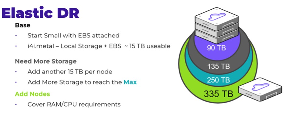 The NC2 portal gives you the flexibility to start with a small amount of EBS storage and grow this on-demand at a later time. A good example of this is with disaster recovery use cases where you could deploy a 3-node NC2 cluster with a small amount of EBS storage to cover the storage usage from replicating the data for Tier-1 workloads that need fast recovery.