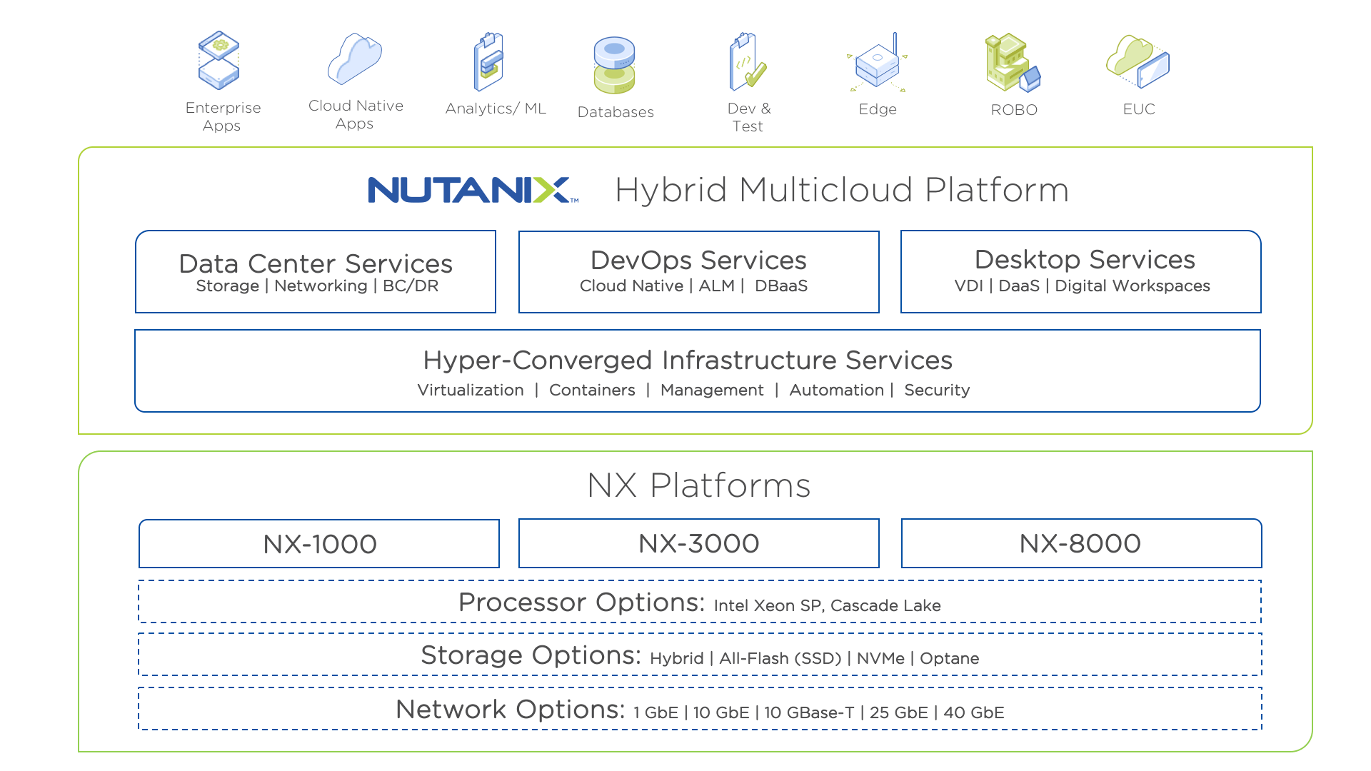 As plataformas da série Nutanix NX são projetadas para suportar uma variedade de infraestrutura hiperconvergente e soluções privadas, híbridas e multinuvem.