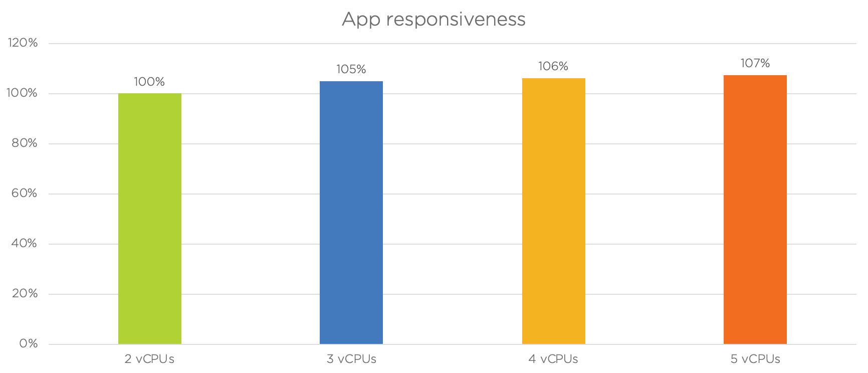 Die Entscheidung, wie viele vCPUs einer VM zur Verfügung gestellt werden sollten, hängt wesentlich von den verwendeten Applikationen ab. Es gibt Programme, die sehr stark von einer höheren Anzahl an CPUs profitieren, während andere Anwendungen nicht mehr als eine oder zwei davon nutzen, auch wenn weitere vorhanden sind. Trotz dieser Unterschiede ist es bis zu einem gewissen Grad sinnvoll, auf mehrere vCPUs zu setzen. Das zeigen Testergebnisse zur Applikations-Performance, wenn mehr vCPUs zu Verfügung stehen.