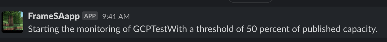 With those two parameters, the first thing the script does is to obtain the name of the Frame account and send a message to Slack to confirm it is monitoring the Frame account.