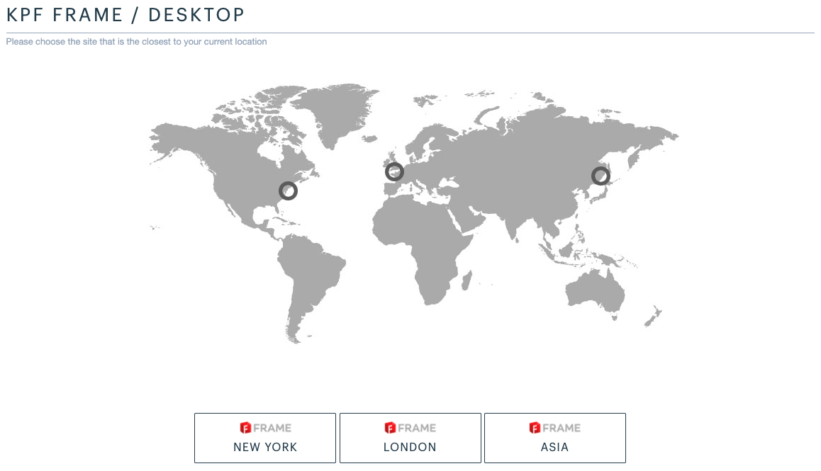 If your DaaS solution simply cannot support the distances and latencies required between your end-users and their workload VMs (based on data locality requirements), then a multi-region design with a data replication strategy may be required. This was the case for Kohn Pedersen Fox (“KPF”), a leading architecture firm with projects around the globe. KPF utilizes Nutanix Frame VDI to deliver business critical applications such as Autodesk AutoCAD and Revit, 3DS Max, and Rhino to their end-users. To deliver the most optimal performance for these applications, KPF has a multi-geo deployment with Frame Accounts deployed in AWS Regions in the US, UK, and Southeast Asia. To ensure their data is available in all three regions, KPF leverages Panzura for global data replication and synchronization. The following figure shows KPF’s custom front-end site for access to Frame - users simply choose the region that they are closest to.