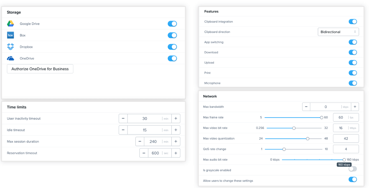 • What are the Frame Remoting Protocol session settings? FPS, QoS engine, video buffer, bitrate, YUV444 enabled, AudioHQ mode, Microphone enabled, using USB devices to name some?