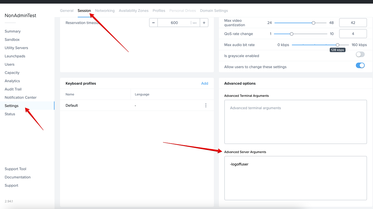 With the new Frame Guest Agent (FGA) 8.x, a feature has been added so Launchpad users are logged into non-persistent workloads as a non-administrative user. This feature can be enabled by going into the Frame Account Dashboard and navigating to “Settings” -> “Session” -> “Advanced Server Arguments''. In that text box, you simply place ‘-logoffuser’ and then save the change.