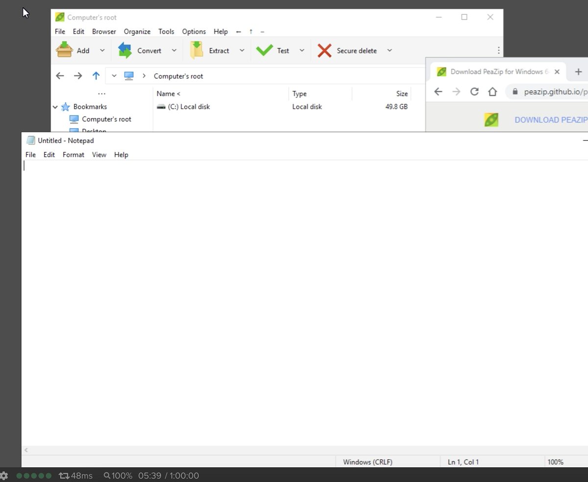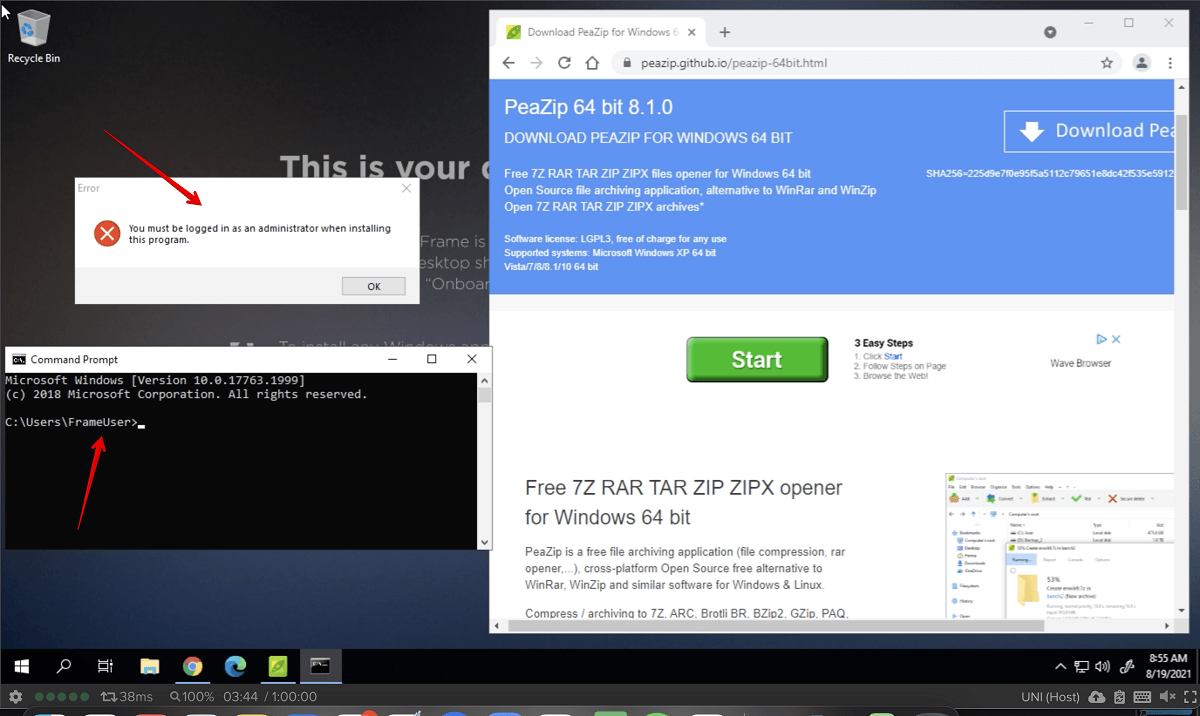 Now, if you start a session, you will be logged on as local Windows user “FrameUser”. This user does not have administrative privileges and is unable to install peazip.