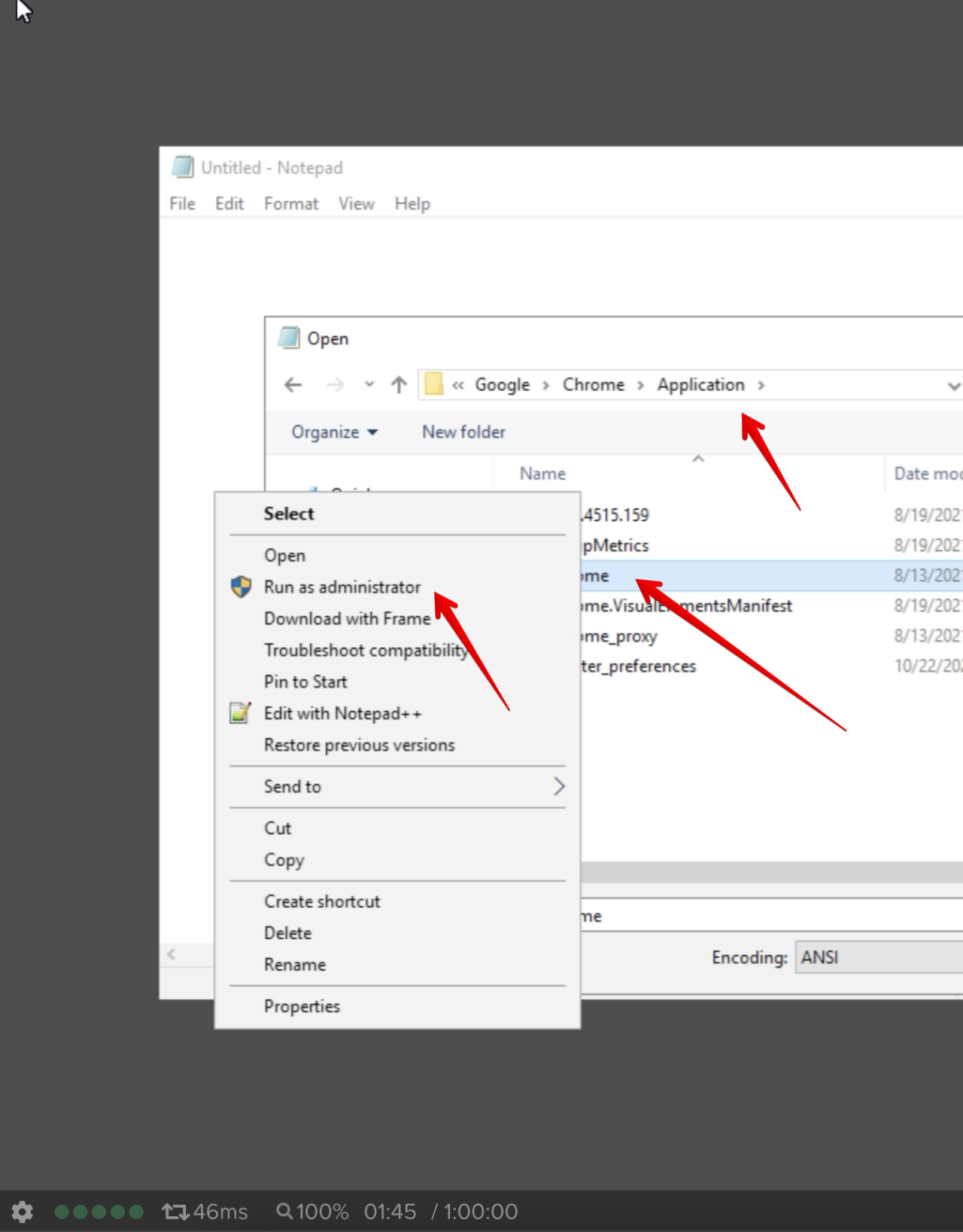 However, it does not completely prevent this. On my test account, I created an Application Launchpad that limits users to using Notepad only. Launching a Frame session provides only that Notepad application and the user can not use many of the traditional Windows desktop functions directly. A determined user can use the “File open” dialog of Notepad to find the Chrome browser executable (C:\Program Files (x86)\Google\Chrome\Application) and then right click and “Run as administrator” to bring up the Chrome browser.