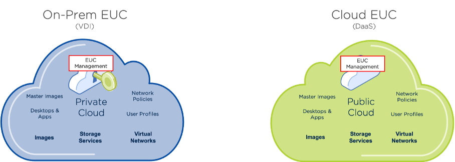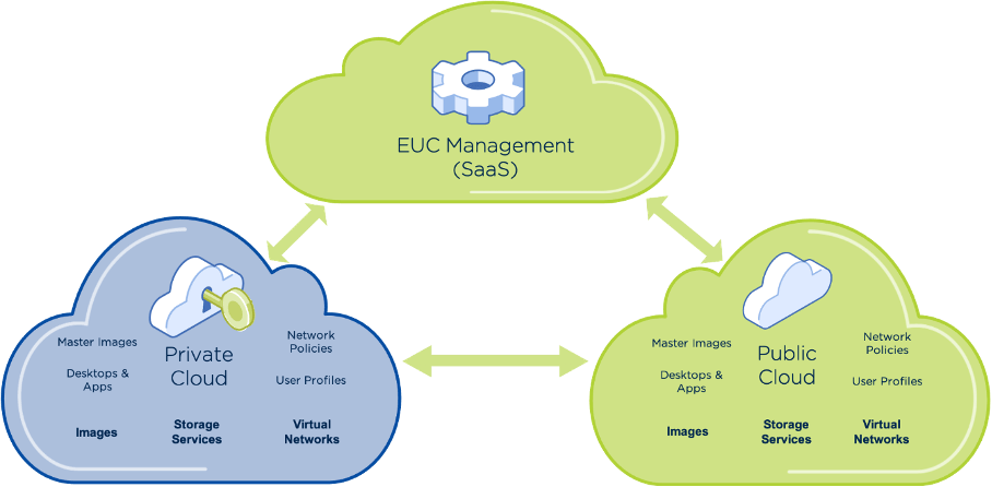 The need for EUC to be rapidly deployable and easily scalable—while better meeting the needs of dynamic business operations and demanding end users—requires a new model that combines the advantages of on-premises and cloud EUC without the disadvantages of having completely separate environments. A hybrid EUC model is emerging, using a flexible mix of both private and public cloud resources and allowing you to quickly adjust the mix based on your business needs.