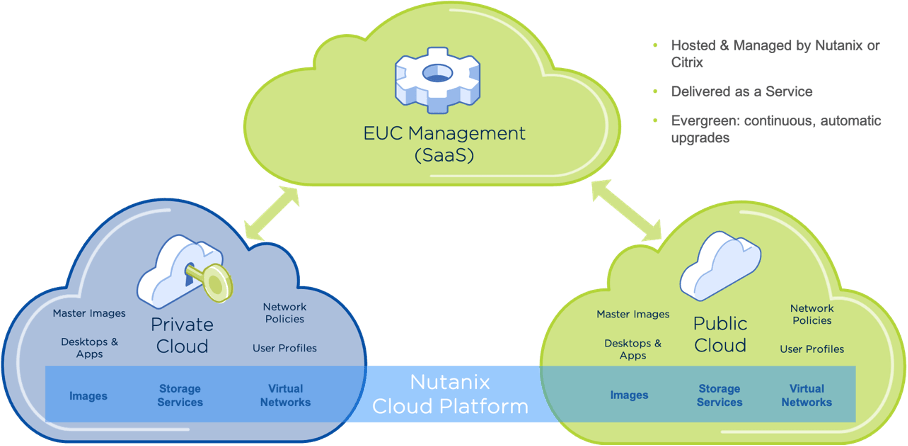 Nutanix enables the cloud management pathway via either the Nutanix Frame® solution or our Citrix Virtual Apps and Desktops solution in combination with Citrix® CVAD service (Citrix Cloud). The Nutanix® Cloud Platform enables you to manage the underlying infrastructure for EUC in private and public clouds using a single set of tools.