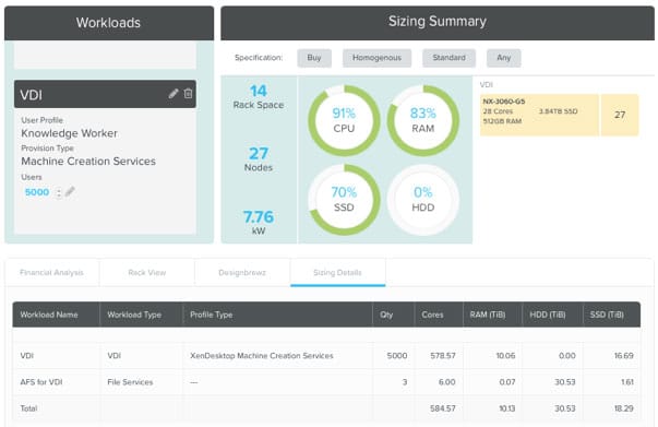 Consider the Nutanix Sizer scenario below for 5000 Citrix XenDesktop knowledge workers, which would require 27x NX-3060-G5 nodes, each with 28 processor cores in 12U of rack space to power all required VMs and user home storage (based on 2 vCPUs, 2 GiB RAM, 10GiB user data and 20GiB gold image capacity):