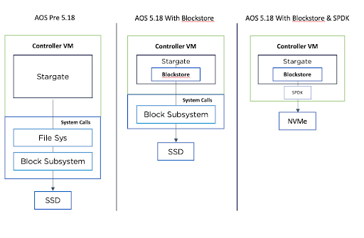 Blockstore enables AOS to leverage Intel SPDK (Storage Performance Development Kit) for direct access of NVMe devices from user space. SPDK implements a lockless, polled-mode, asynchronous NVMe driver written in user space. This enables AOS with zero-copy, highly parallel direct access to NVMe and Intel Optane devices, leading to lower latency and latency variance as well as reduced CPU utilization. SPDK integration is in technology preview with the 5.18 release.