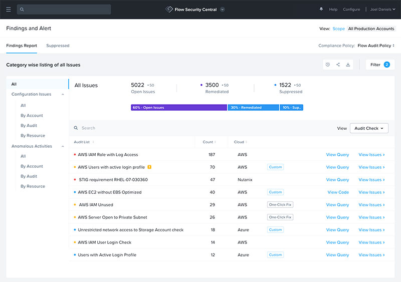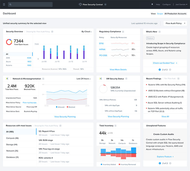 Security Posture Monitoring with dashboards and reports to offer “at-a-glance” information about current security compliance (PCI, HIPAA, etc) goals, network utilization, general security health of Nutanix clusters, and a comprehensive multicloud inventory view.