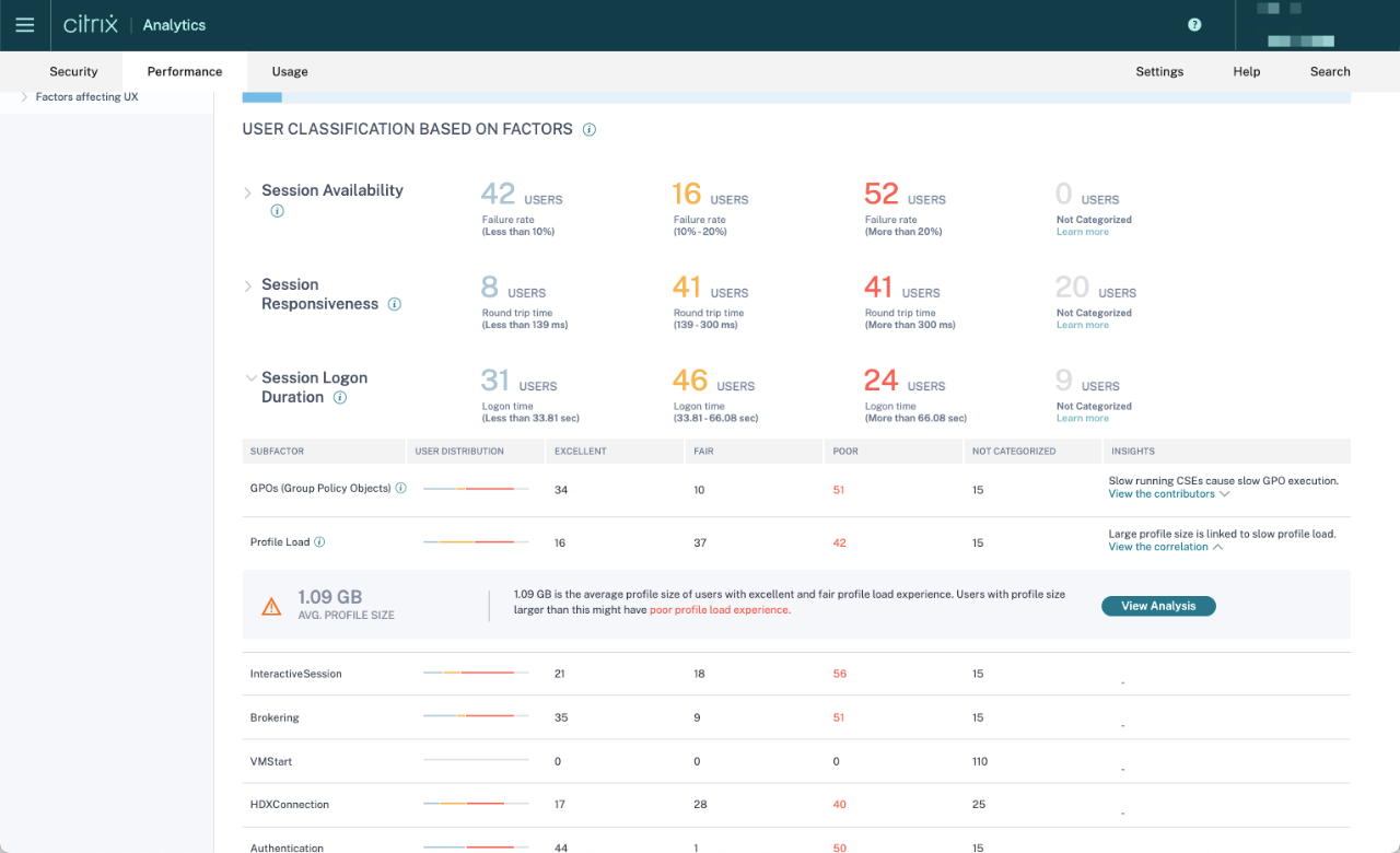 The user experience score is calculated based on different performance factors that affect a user session including: session logon duration, session responsiveness, session availability, and session resiliency. These factors also have sub-factors associated with them. The factors are dynamically calculated on a per customer basis and recalibrated based on metrics collected during the past 30 days. This is to account for any changes that were made within an environment. Administrators are able to look at exactly what is causing a user to have a poor experience and dig deep into the factors/subfactors. Citrix Analytics even provides administrators with insights as to why someone might not be having an optimal experience; allowing administrators to proactively resolve issues before they become a problem.