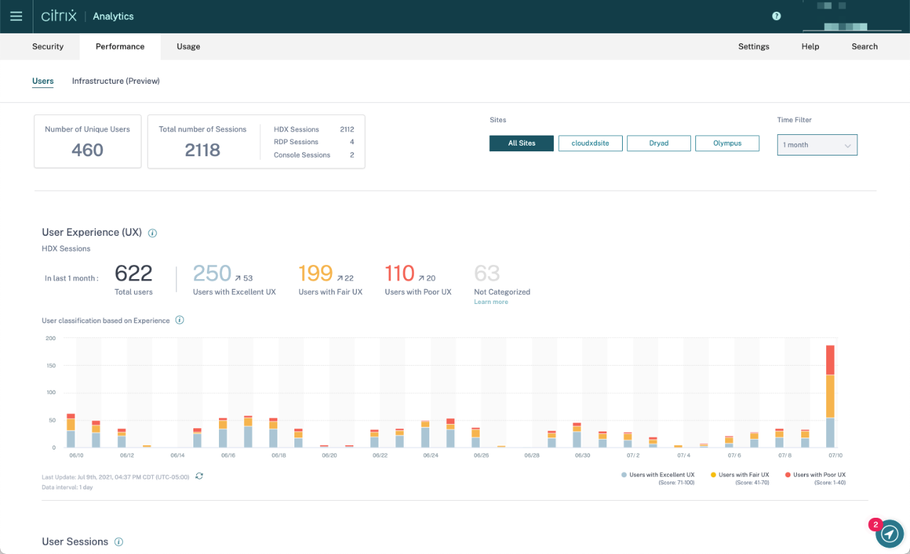 The user experience dashboard shows administrators information on the experience their users are having. Citrix Analytics does multi-site aggregation, making it easier for administrators to have a holistic view of their environment or filter out for a specific site. Although Citrix Analytics is a cloud service, it is able to gather information for both on-premises or cloud environments alike.