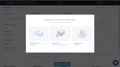 Once you sign up for Test Drive and log in, you’ll be presented with three experiences. Under “My Infrastructure,” you can manage your virtual infrastructure with Prism and AOS. “My Operations” lets you monitor and plan with Prism Pro. Lastly, “My Applications” enables you to deploy and publish applications with Cloud Application Lifecyle Management (CALM). To learn more about all the new functionalities within Test Drive, read this blog.