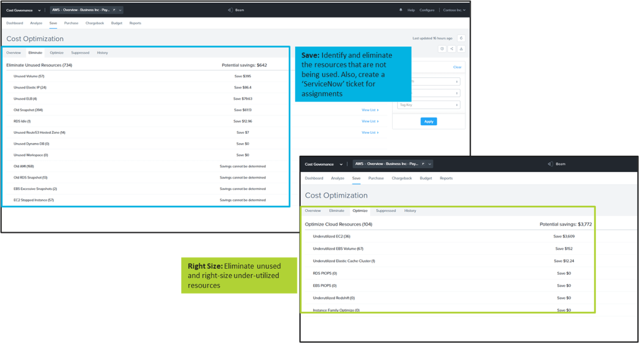 Beam identifies resources that you are paying for but not using optimally – these can be completely unused resources, or partially utilized resources. Our solution does this by looking at various metrics such as CPU, memory utilization, Network I/O, etc. You can then easily delete resources that are identified directly from Beam console as unneeded and down-size resources identified as under-utilized.