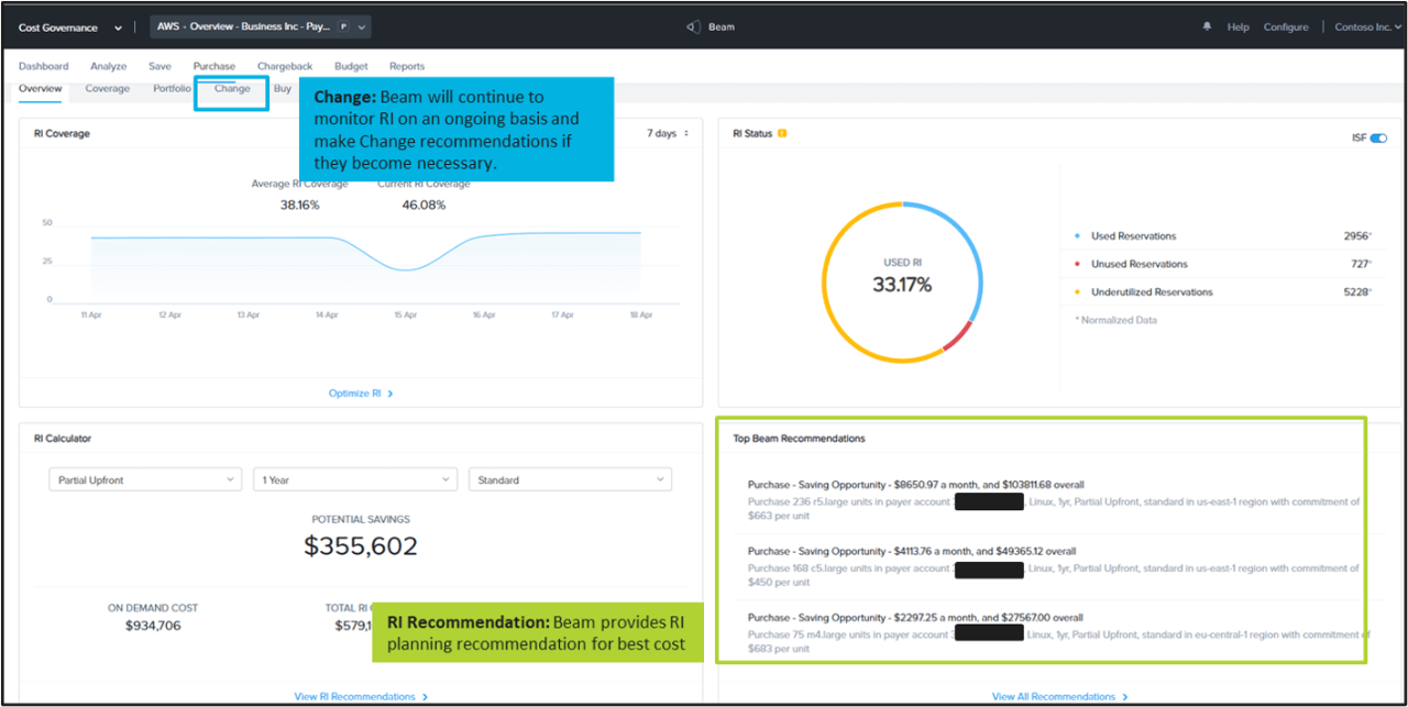 One of the biggest sources of cost savings is switching from on-demand to reserved instances (RI). But, how do you decide how many RIs to purchase and of what type? Beam does the necessary analyses for you by looking at the instances you are running continuously over a 14- or 30-day lookback period and makes recommendations for RI purchases based on its findings. It also shows you a cost analysis of RI vs on-demand instances.