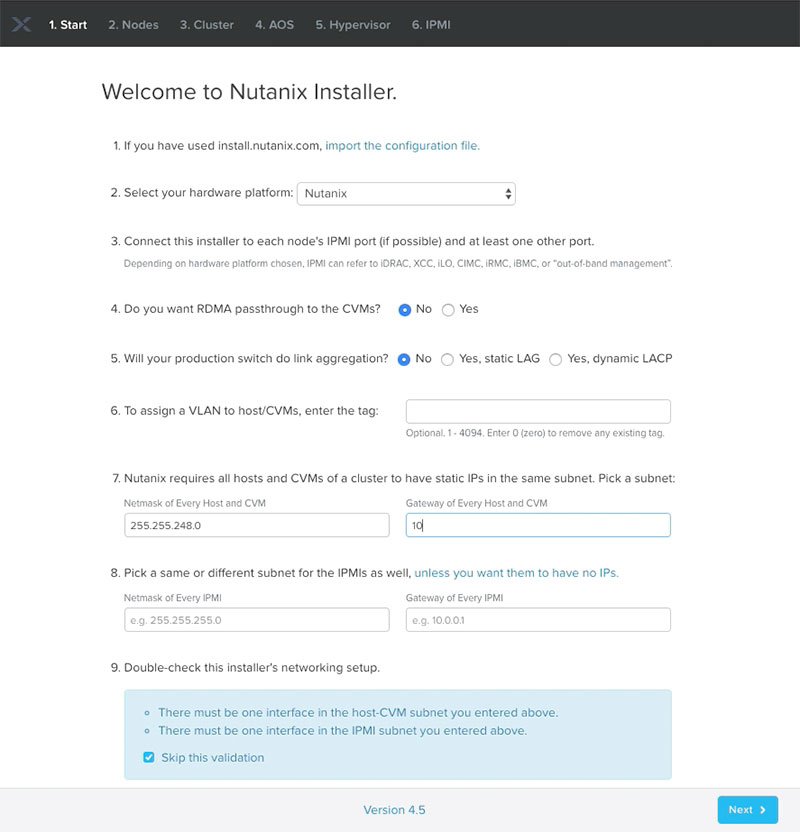 With most infrastructure solutions, installing the necessary software on new hardware nodes is a time-consuming—and potentially error-prone—process. With Nutanix Foundation, once the hardware is racked and stacked, the installation is simple, highly automated, and fast. The Nutanix Installer guides you through a series of simple dialogs to assign necessary IP addresses, configure new nodes, define cluster resiliency and other parameters, choose the desired software and hypervisor versions, and provide Intelligent Platform Management Interface (IPMI) credentials. Nutanix provides default settings for IPMI and other settings wherever that simplify the process further.