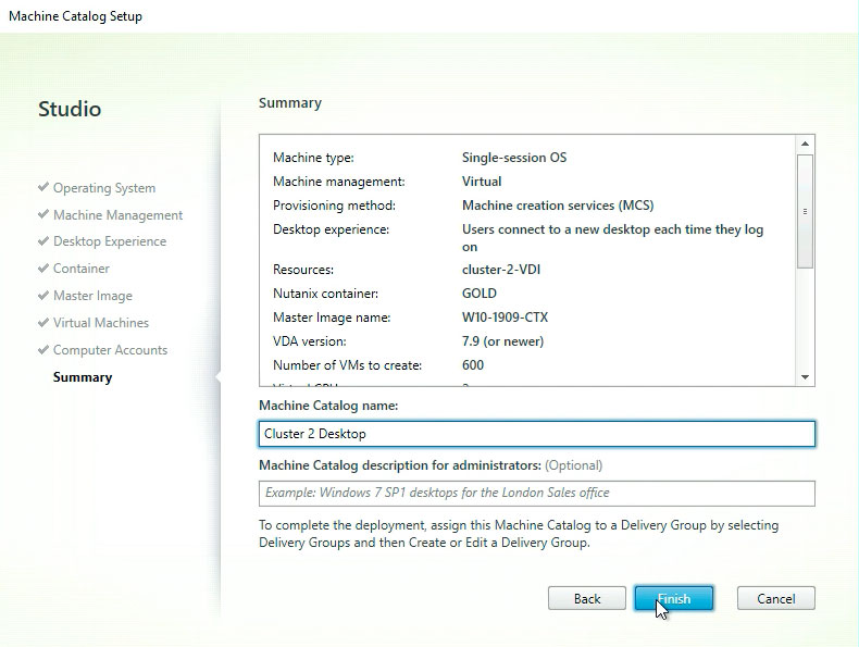 Creating a machine catalog for the new cluster is accomplished using the Citrix “Create Machine Catalog” action which guides you through the necessary configuration steps. There are a few details to be aware of for each step: