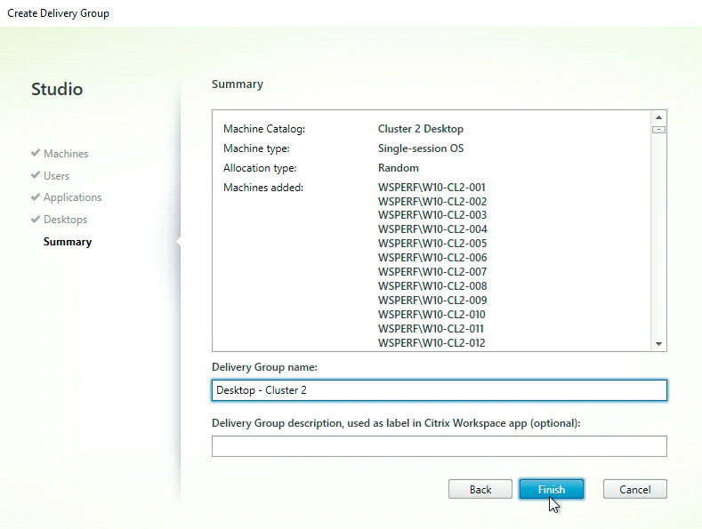 Once the machine catalog is ready, the final task is to create a delivery group using the Citrix “Create Delivery Group” action. (Alternatively, you can add the new desktops to an existing delivery group if you prefer.) Again, the procedure progresses through all the required steps, including selecting the machine catalog, configuring the number of machines in the delivery group, adding applications (if any), and specifying who can use the desktops.