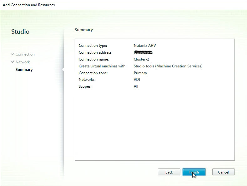 Adding the new cluster to Citrix requires a new connection and resources to be defined. This is simply a matter of configuring the connection type (in this case AHV), and supplying credentials, an IP address, and a name. The process takes at most a few minutes.