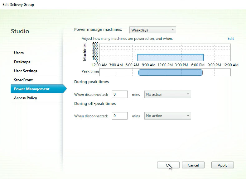 Once the delivery group is created, the virtual desktops on the new cluster become available for use. You can return to the delivery group to adjust power management parameters as needed to ensure that users can log on quickly, without using excessive resources during off-peak hours.