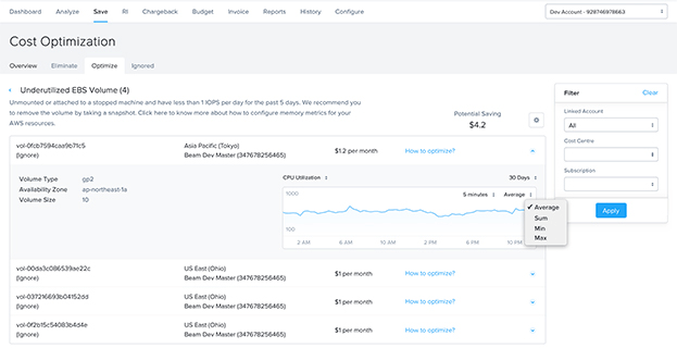 Another challenge when sizing public cloud resources is ensuring that they are sized appropriately for the workloads they are running. For example, using a bulky AWS EC2 instance (say, m4.4xlarge) for a lightweight dev/test workload adds unnecessary spending. Monitoring the utilization metrics and re-sizing resources according to actual usage adds a significant amount of cloud savings. Our customers report on average 10-15% savings on their cloud spend simply by optimizing their infrastructure.