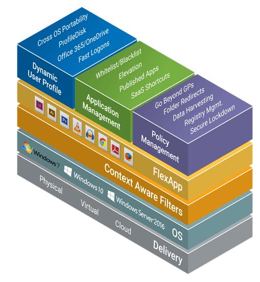 ProfileUnity is a User Environment management solution that delivers a full spectrum of features that includes Profile Management, and Centralized Policy Management that goes beyond traditional Microsoft Group Policies, as well as advanced features such as Privilege Elevation and Application Rights Management.