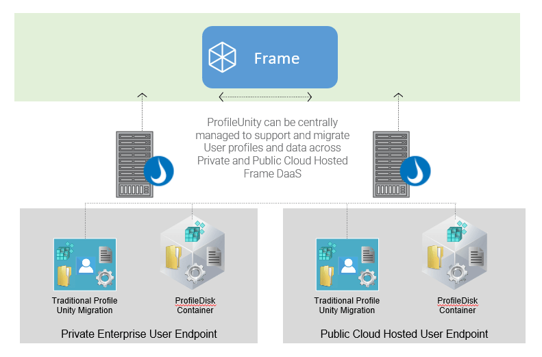 Let us say for example you are in a hybrid cloud model (see figure below) and using both private and public Frame accounts that you wish to have the user experience within each be referenced and maintained from a central location for the user's persona. Or you want multiple Frame accounts with the same cloud model to use a centralized solution. ProfileUnity is a great fit for these use case needs and requirements.