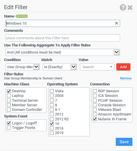 The granular control that ProfileUnity context-aware filters provides, also significantly enhances workspace security with precise policies that also are universally applied to all Windows desktops in the environment. The Filter Screen to manage this is as shown in the figure listed below: