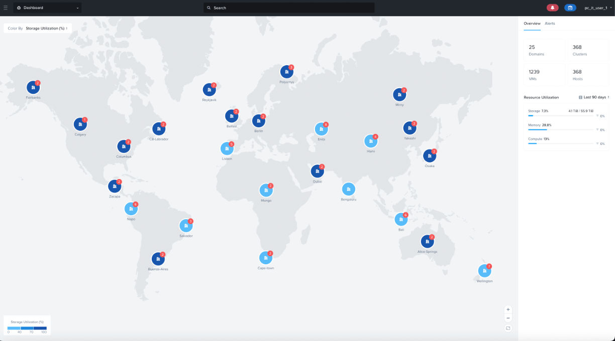 From a single, easy-to-use dashboard, get a bird's eye view of your hybrid multicloud infrastructure across data centers and geographies. View comprehensive domain and cluster metrics, including capacity utilization and alert summary statistics, and easily monitor and manage the health of each Prism Central (PC) domain.