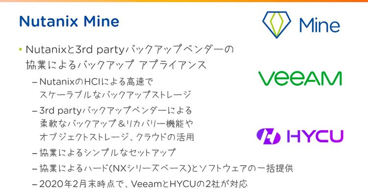 これらを解消する手段としてNutanixが提供しているのが、「Nutanix Mine」です。Mineは、Nutanixとバックアップベンダーの提携により開発された、NutanixのHCIをベースにしたバックアップアプライアンス製品です。本稿執筆時点で対応済みなのはVeeamとHYCUの2社で、NutanixのHCI上に対応バックアップ製品がセットアップ済みの状態で提供されます。これにより、設計や構築の手間がなく、すぐにバックアップの設定が開始できます。また、データ保管先となるストレージもNutanixのHCIに準じた、高いパフォーマンスとスケーラビリティがあり、RTOの短縮にも効果的です。当然ながら、各バックアップ製品の持つ柔軟な機能がそのまま利用できますし、Mine向けのユーザーインターフェースの統合も行われているため、3rd partyバックアップ製品が必要な場面では有力な選択肢となるでしょう。