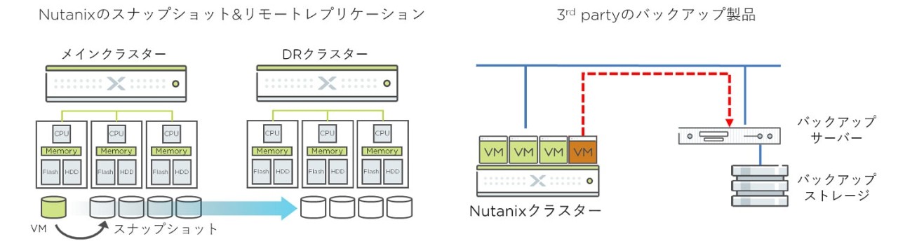 「RAIDによるデータ冗長化とバックアップは違う!」という話をよく聞くと思いますが、Nutanixの分散アーキテクチャによるデータ冗長化もバックアップとは違います。なぜなら、データ冗長化とバックアップでは、データを保護できる範囲が異なるからです。例えば、人為的なオペレーションミスやアプリケーションの問題などで、誤ったデータの書き込み処理が実行された場合、データ冗長化処理では誤ったデータをリアルタイムに冗長化してしまうため、正しいデータへの回復作業ができません。そもそも、データ冗長化の真の目的は「データ保護」というよりも、ディスクの故障が発生した場合においてダウンタイムなく処理を続ける「可用性の担保」のための仕組みだからです。逆に、データの冗長化を行わずにバックアップだけ取得していた場合、ディスク故障などが発生したときには、故障したディスクの交換やデータのリストアを行わないと業務再開できませんし、最後にバックアップを取得した時点から故障発生時点までのデータは失われてしまいます。ですから、データの冗長化とバックアップは「そもそも別のもの」であり、「どちらも必要」と言えます。