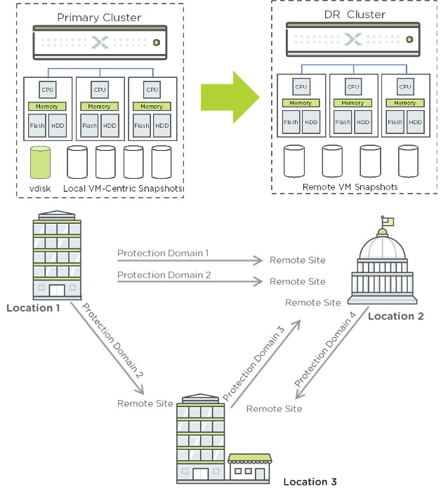 Nutanixにおいては、前述の仕組みを用いて単一Nutanixクラスター内でのローカルスナップショット、およびほかのNutanixクラスターへの非同期レプリケーションが標準で提供されています。Nutanixクラスター全体・ラック全体・データセンター全体などの広範囲の障害に備えるには、リモートスナップショットが有効です。もちろん、レプリケーション先のNutanixクラスターでも仮想マシンを起動することができますので、単なるバックアップではなく、RTOの短い DR環境が構成可能です。