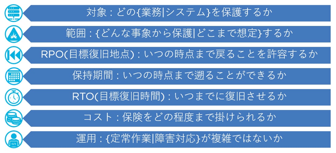 バックアップやDRがその真価を発揮するのは、何らかの問題が発生したときであるため、その問題を想定して、適切な対応策を講じておくことが重要です。下図は、バックアップやDRを行う上での主なポイントを項目別にまとめたものです。