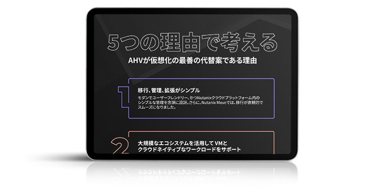 Nutanix AHV は、モダンでセキュアな仮想化プラットフォームです。データセンター、エッジ環境、パブリッククラウドで実行する仮想マシンとアプリケーションを強化します。