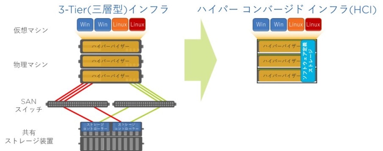 第1回のコラムでも紹介したとおり、HCIは、従来型の仮想化基盤におけるサーバー・SANスイッチ・共有ストレージ装置を組み合わせた3 Tier構成とは異なり、ハードウェアとして見るとサーバーを複数台並べてイーサネットで接続しただけのシンプルなものになります。また、サーバーそのものは、特殊なものではなく、ごく普通のラックマウントサーバーです。
