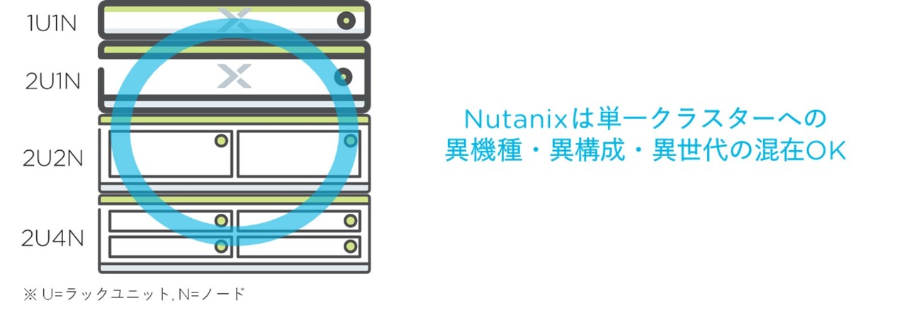 また、2ノード構成のHCIというものを耳にすることがありますが、これはHCIが本来持つスケーラブルアーキテクチャーを捨てた「単なるミラーリング」であり、容易なスケールアウトはできない点に注意が必要です。Nutanixにも2ノードや1ノードでの構成は存在しますが、拡張不要な小規模拠点やエッジコンピューティング用と位置付けられています。