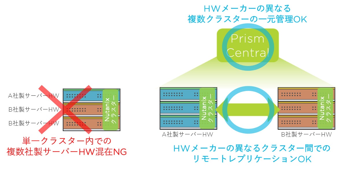 Nutanixが提供する「Prism Central」というマルチクラスター管理ツールで、異なるHWメーカーのNutanixクラスターを一元管理することや、異なるHWメーカーのNutanixクラスター間でリモートレプリケーションを構成することなどは、問題なくサポートされます。