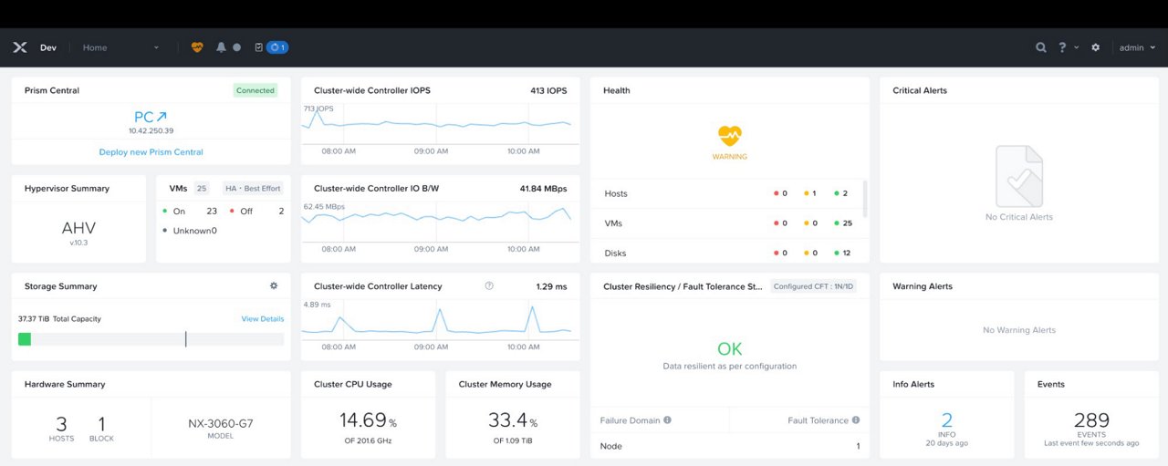 The Nutanix Prism1 management plane simplifies the management of virtualized datacenter environments by consolidating compute, storage, networking, automation, and disaster recovery into a single, intuitive interface - minimizing operational complexity and eliminating the need for multiple standalone tools.