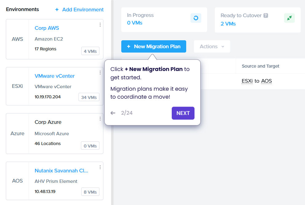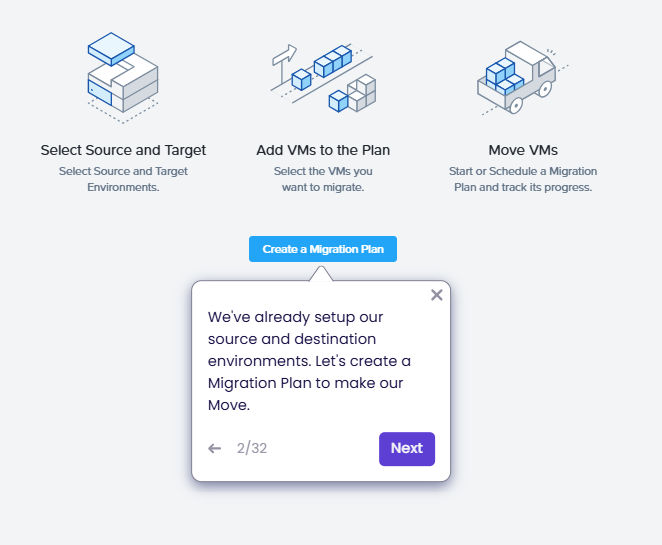 This screenshot shows how easy it is to pick source and target to begin a migration with the wizard-driven interface.