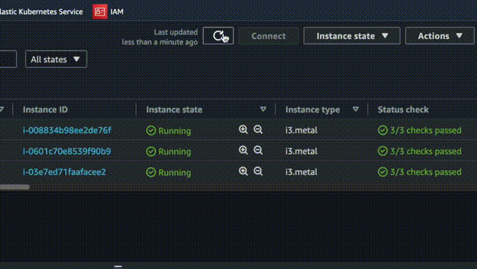 In the AWS console it is possible to witness the process of the i4i.metal nodes being added, i3 and i4i nodes running at the same time while the cluster shifts to run on the new nodes and finally the decommissioning of the i3.metal nodes.