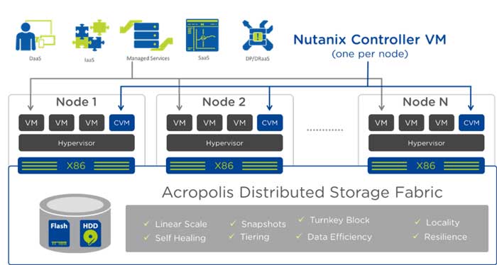 A well-configured enterprise hybrid cloud deployment would involve a distributed storage fabric that virtualizes local storage from multiples and disparate nodes in a cluster into a unified pool. The storage component of a hyperconverged infrastructure uses software to make disparate commodity or legacy hardware systems work together and non-disruptively deploy essential features such as: