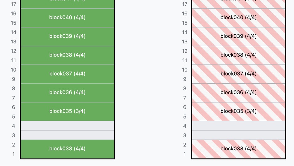 Example of a data center rack with two types of capacity management in action. Left: rack capacity, shown by the “U” elevation numbers, where locations U3 and U4 are empty. Right: capacity is within the server chassis, where the “block035 (3/4)” notation shows that only three out of four available chassis bays are populated.