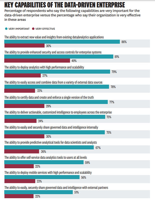 A survey by the Harvard Business Review found that there was a clear consensus among leaders on the capabilities that constitute a data-driven enterprise. Apart from securely accessing data, deploying and scaling analytics, and extracting valuable insights from existing data and apps, three inter-related priorities stood out: