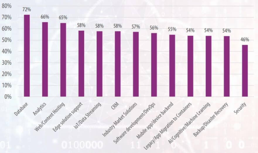 At the moment, however, the most popular workloads across public, private, and hybrid clouds are databases, analytics, and web/content hosting.