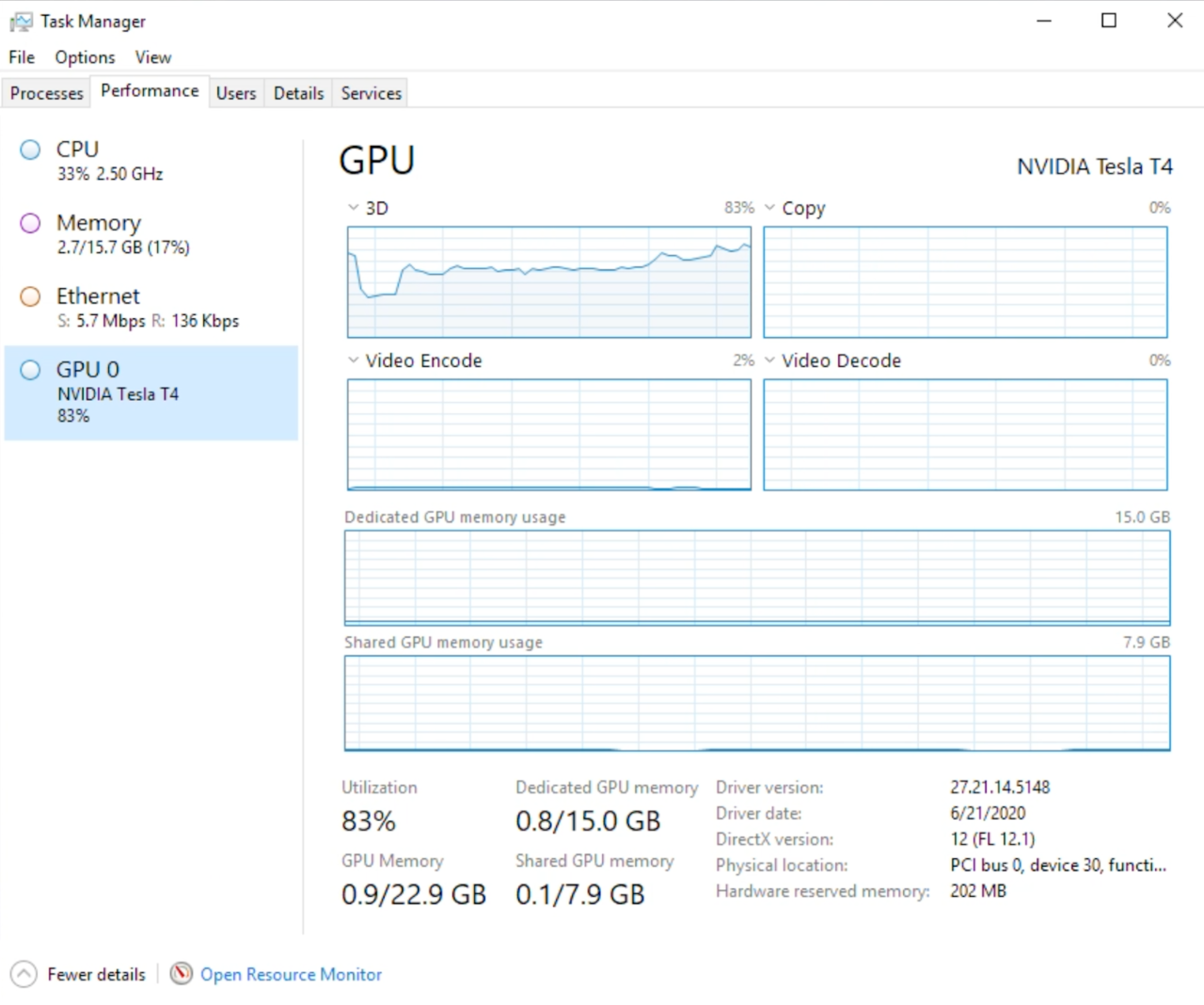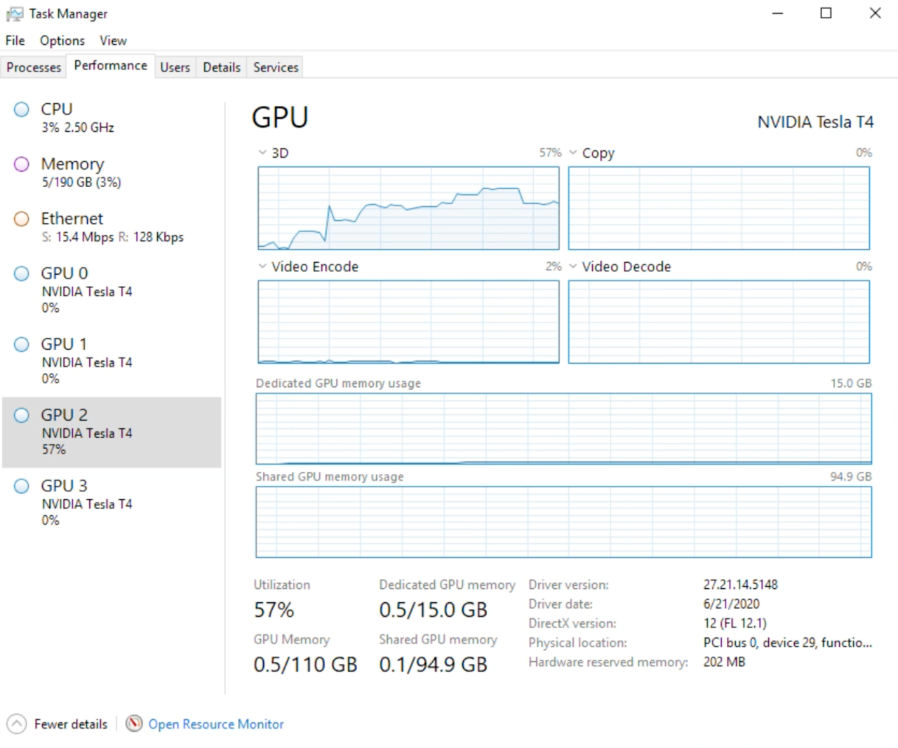 Figure 2: using task manager in Windows10/Server 2019+ to provide GPU utilization insights