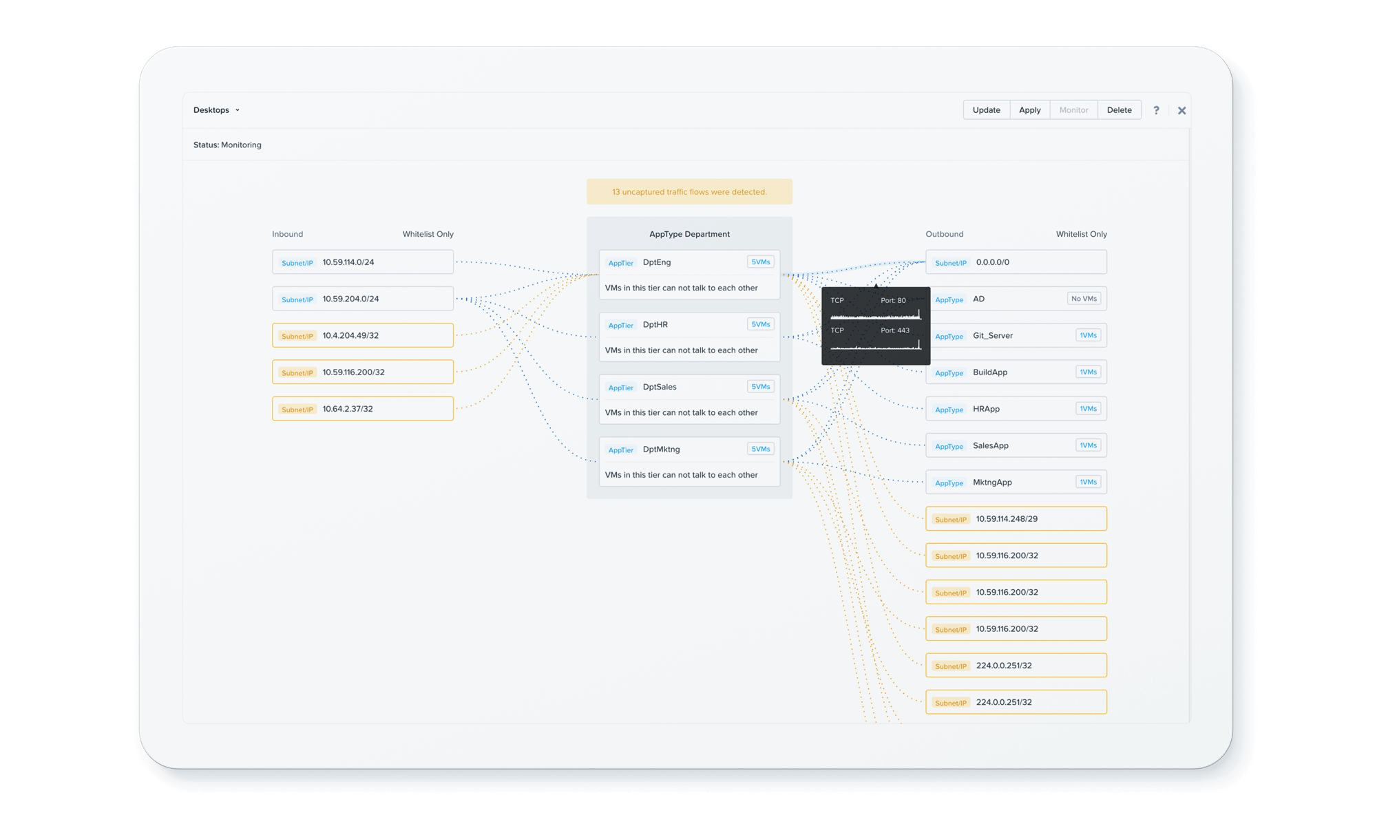 Enable application tiering at the OSI L4 with the option to create deeper inspection at L7 using partner integrations built for Flow Network Security.